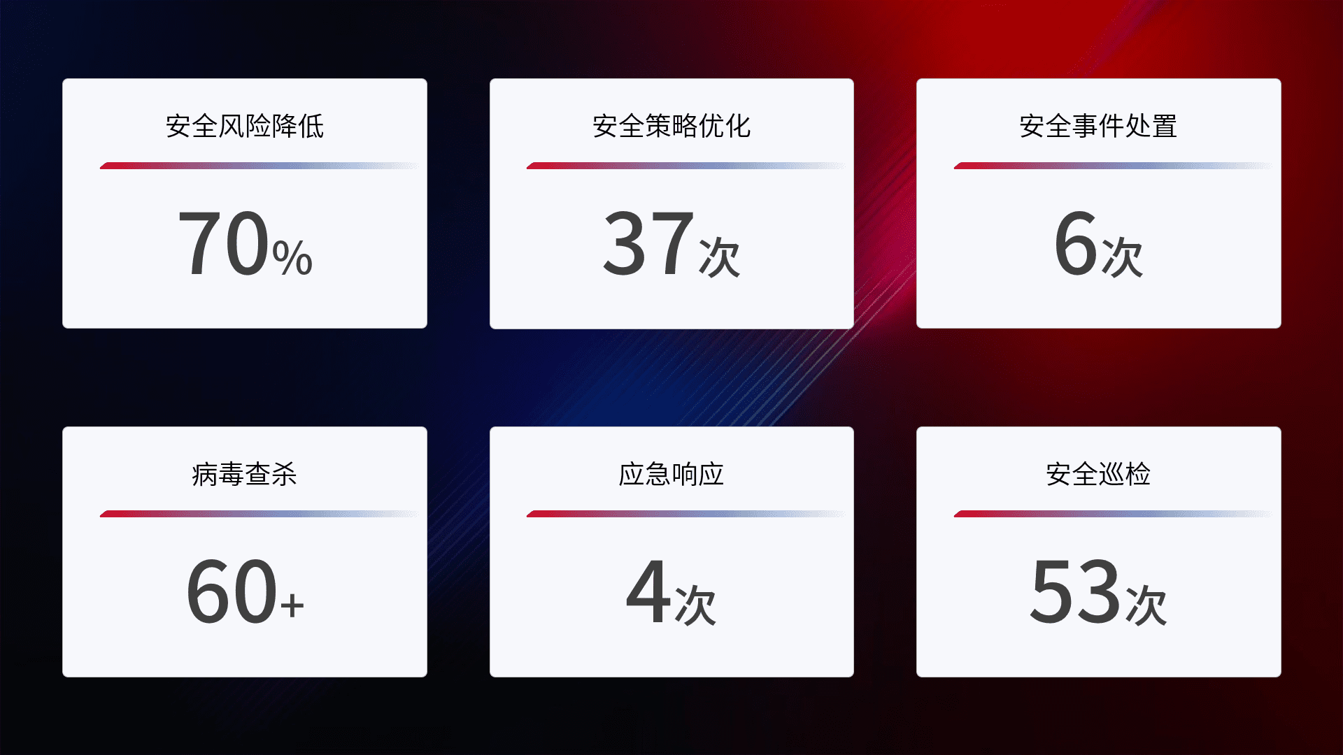 提供全面的安全事件报告体系,,,包括处置报告、、、周报、、季度和年度总结,,,结合持续监控,,帮助客户深入了解网络安全状况。。。
