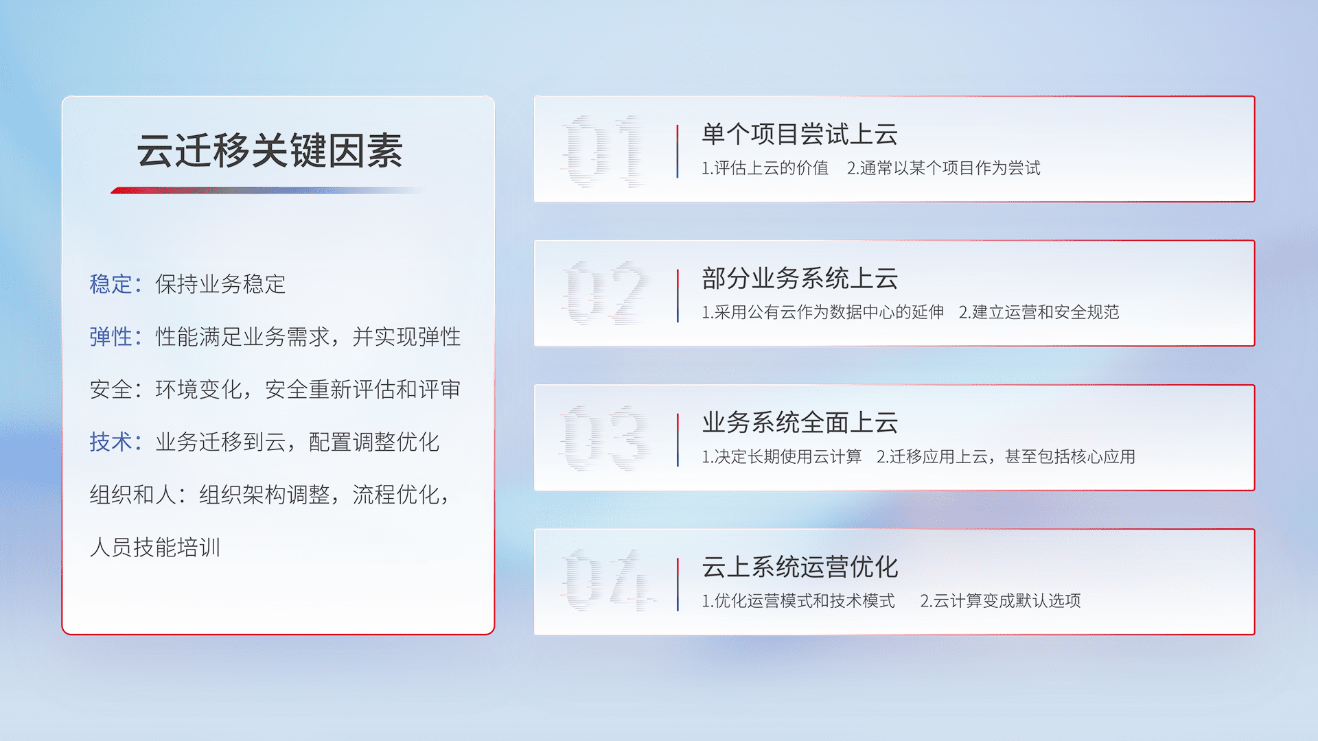 结合实际业务,,,,从规划设计、、、、云平台选型、、、云原生改造、、数据迁移、、、集成交付,,,,迁移全过程为客户识别最佳上云路径,,,,做好风险识别管理,,设计网络架构、、身份权限、、安全审计合规、、操作审计、、、、日志审计、、、监控告警策略、、、、多站点容灾设计等,,,,对云上基础设施进行整体规划,,提升IT治理水平,,,,以满足弹性、、、高可用、、高性能的需求。。。。