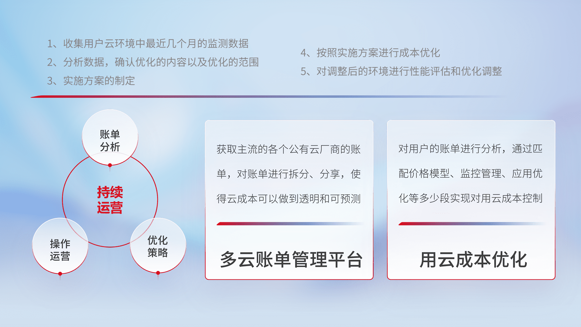 通过多云纳管,,,以统一的资源数据模型把客户的云资源进行抽象和封装,,进而实现对多云资源的统一操作,,保障云资源管理的可靠性、、、、稳定性与可用性。。。。量身定制化运维内容,,配置、、、开发运维、、、、补丁管理、、、备份、、监控、、、、认证和访问管理、、、审计和日常巡检等,,,,保障在用云过程中的可靠度,,,,稳定度以及高可用率。。。