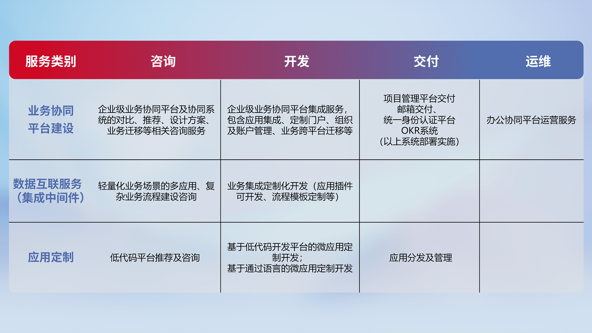 针对钉钉、、企微、、IDaas等平台级产品提供产品的规划、、、方案、、、、交付、、、、定制化开发等服务,,,,实现如统一协同办公、、、智能客户服务、、、、混合会议管理、、、、智能数据查询、、、、等业务场景,,,实现数字化转型。。。。